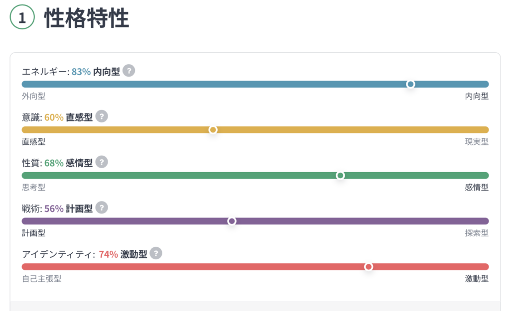 16診断は「I:内向」「N:直感」「F:感情」「J:規律」「-T:ストレスに弱い」
